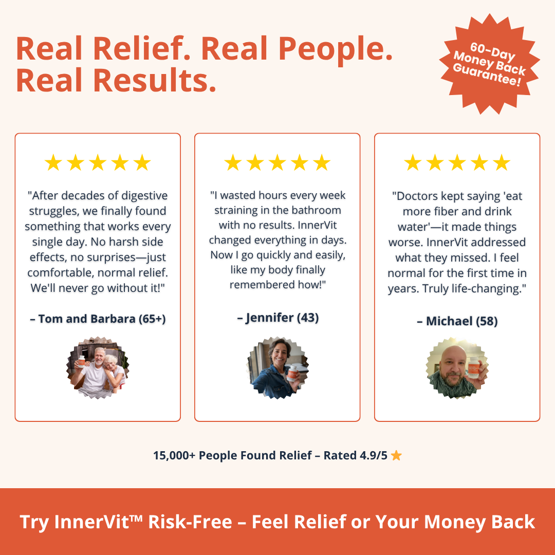 That's why I helped create InnerVit Complete Digestive Comfort combining 6 essential enzymes with targeted probiotics. This gives your body what it needs to break down proteins, fats, dairy, and fiber while supporting natural, daily elimination. My patients report comfortable relief and regular movements within 24-48 hours.